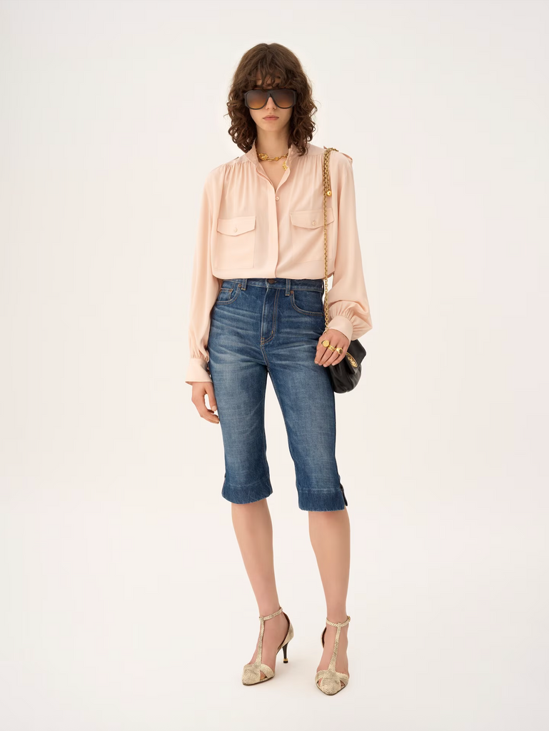 High-neck gathered blouse in organic silk crêpe de chine, featuring flap pockets, shoulder tabs and mother-of-pearl buttons.