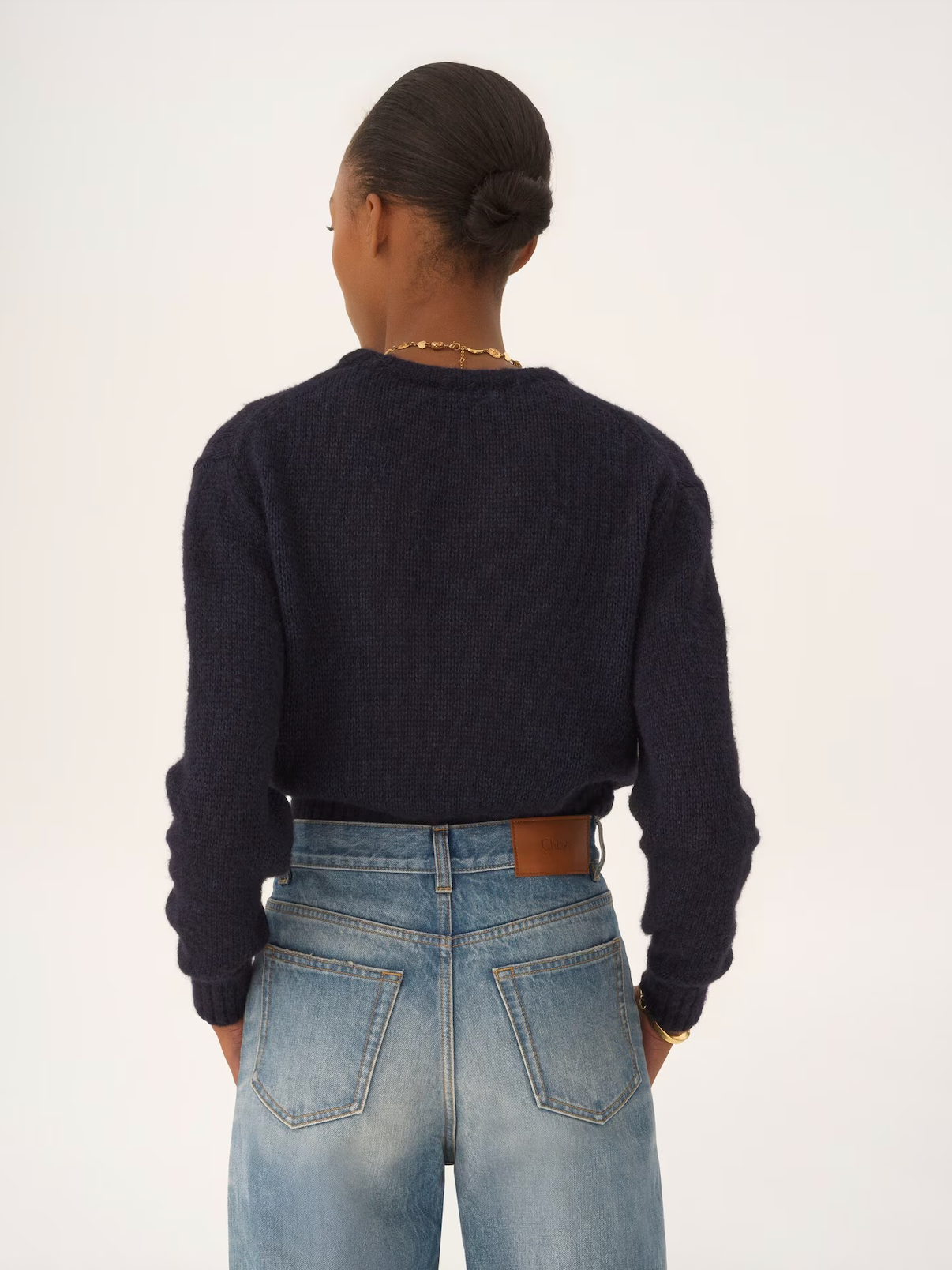 Cropped crew-neck sweater in an alpaca wool and silk knit, detailed with ribbed trims and large Chloé embroidery at the front.