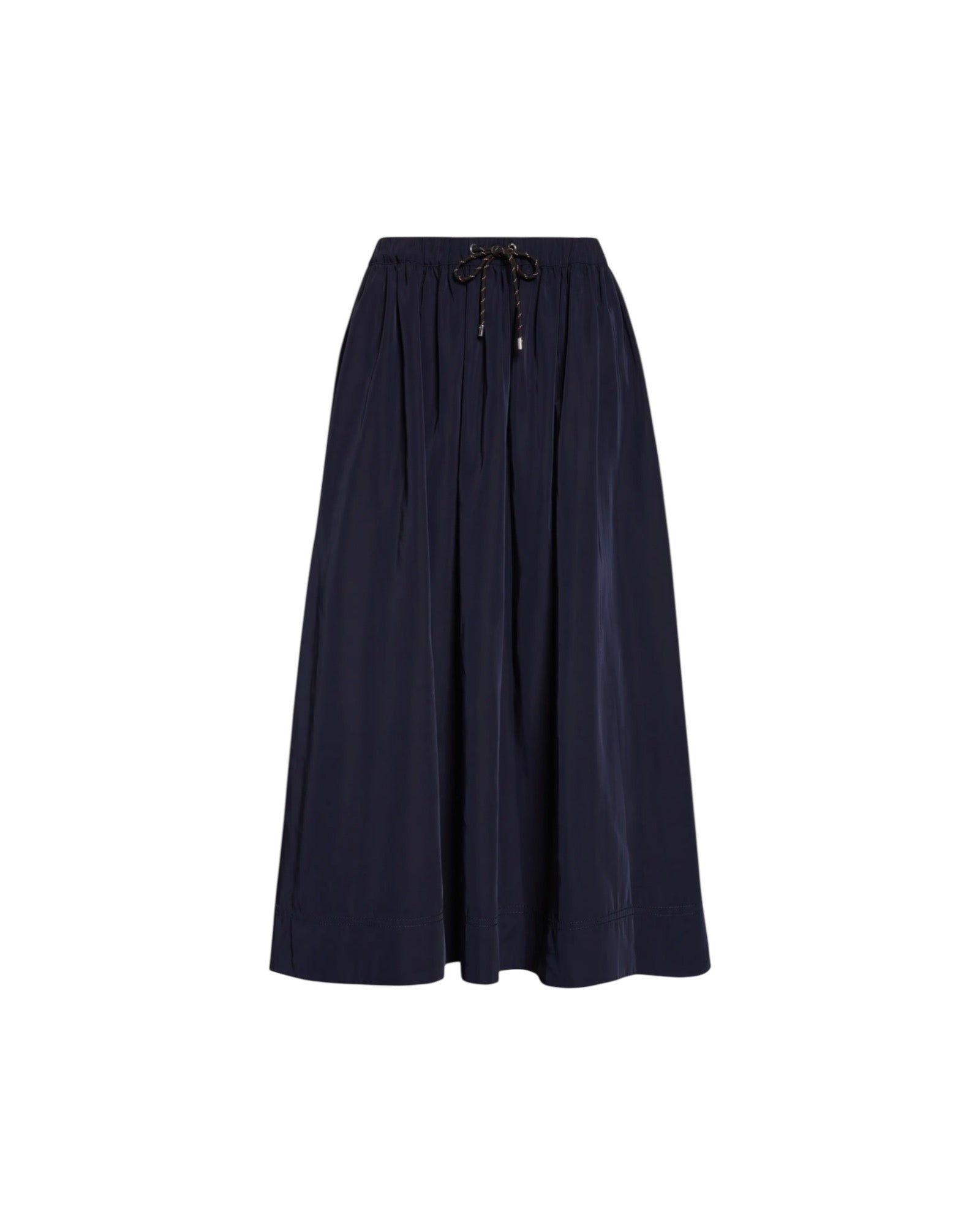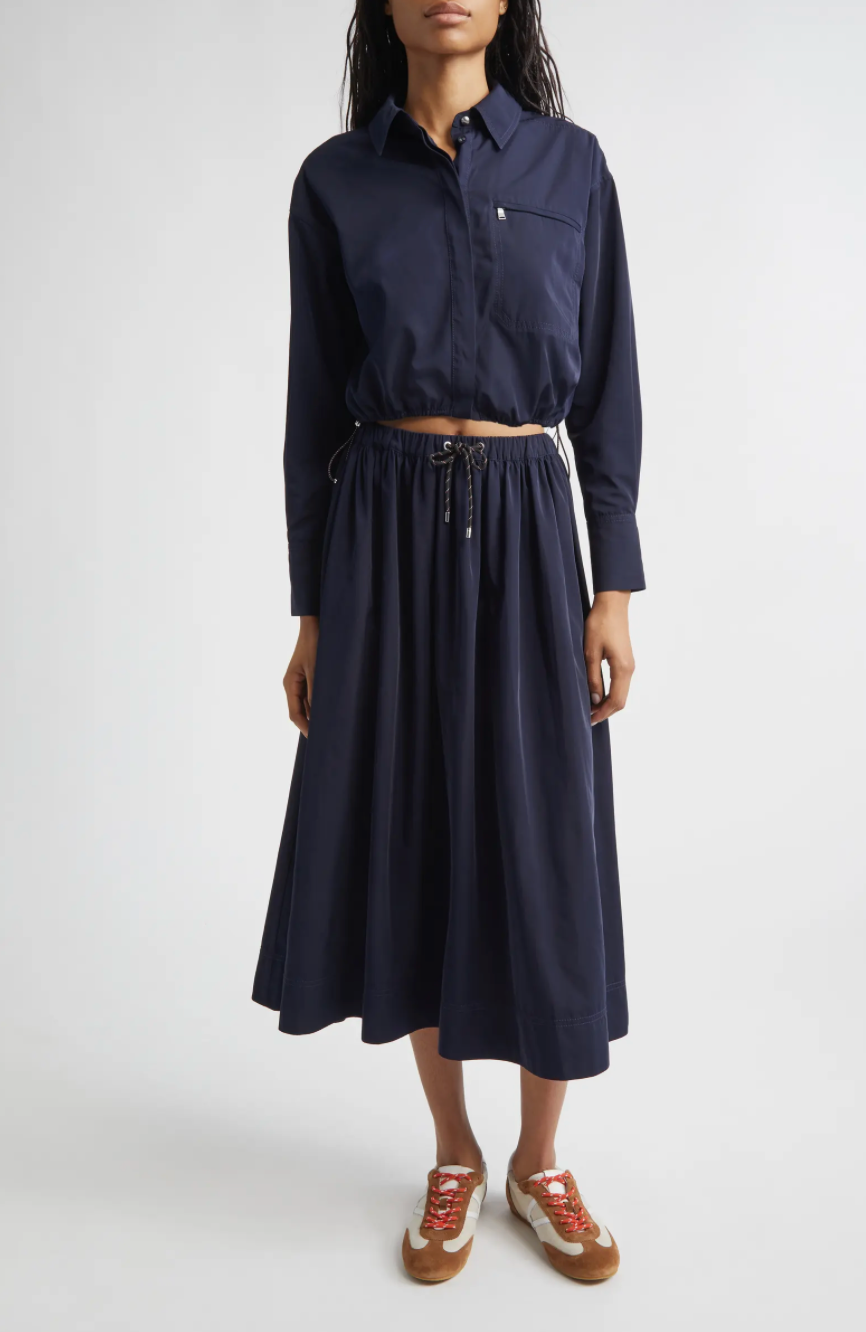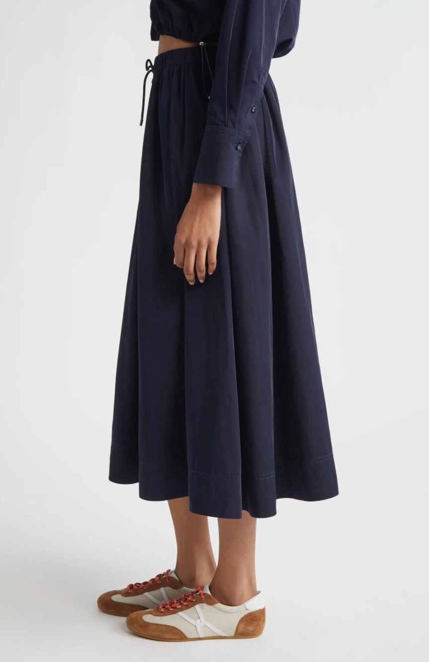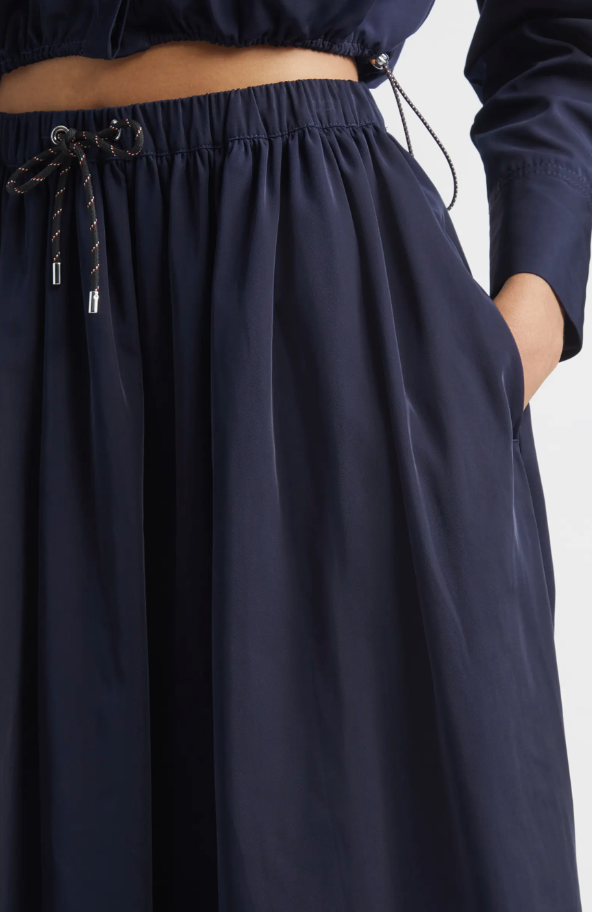 A cool, off-duty take on the circle skirt. Crafted from soft, technical taffeta in navy, the Bates is cut for a full, midi-length silhouette with a relaxed fit. An adjustable bungee drawcord waistband and wide hem lend a sporty finish. Designed for après-ski and beyond, style it with the matching Wilfred shirt for the coordinating set—or pair it with a soft cashmere knit for elevated contrast.
