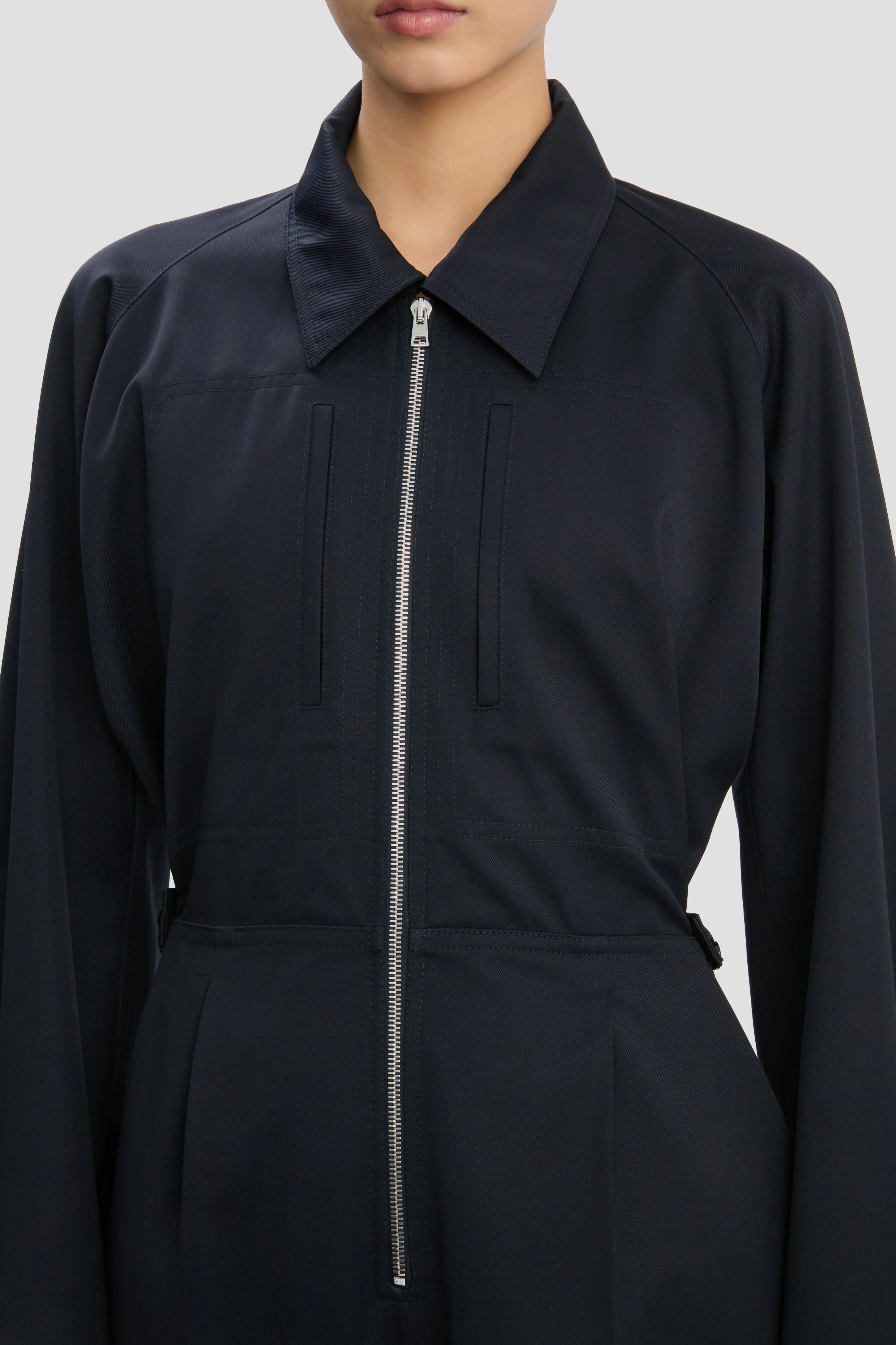 Classic utilitarian design codes are mixed with contemporary design details for an elevated take on traditional workwear. Crafted from a wool blend, the Cargo Jumpsuit in Navy features an exposed front zip in silver, leg cuff zips and knee patches with tonal topstitching. An elasticated waistband creates a figure-flattering silhouette.