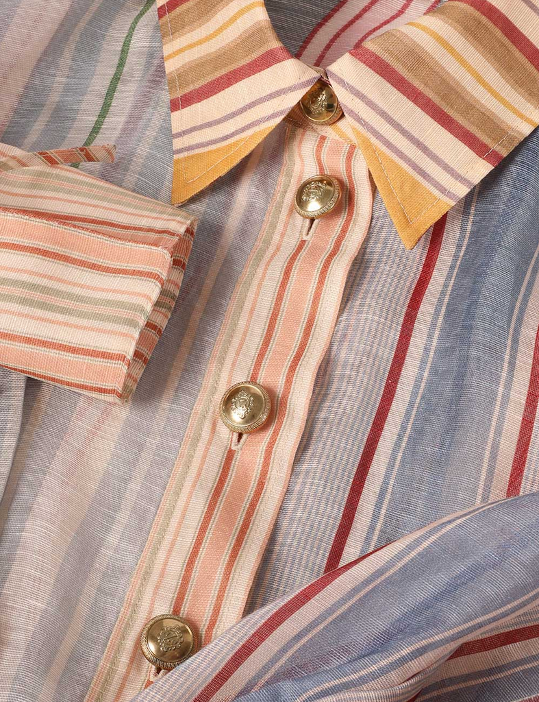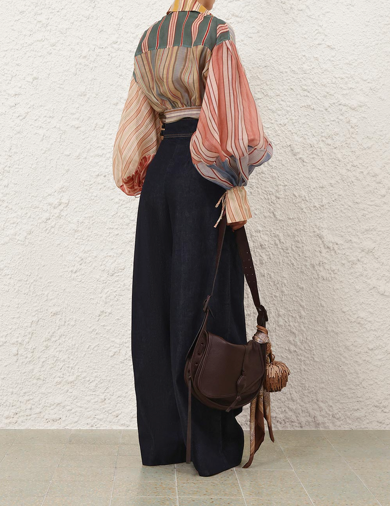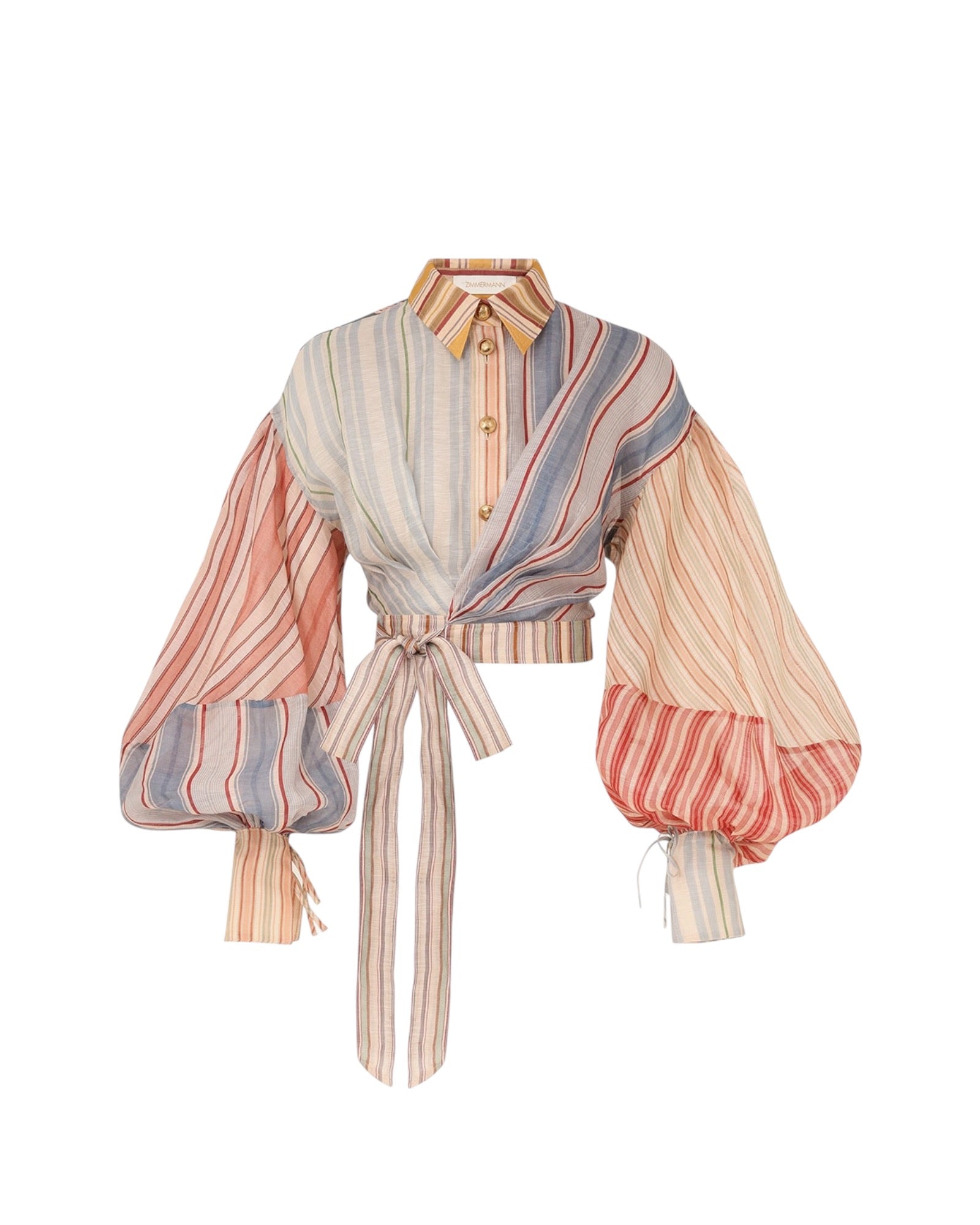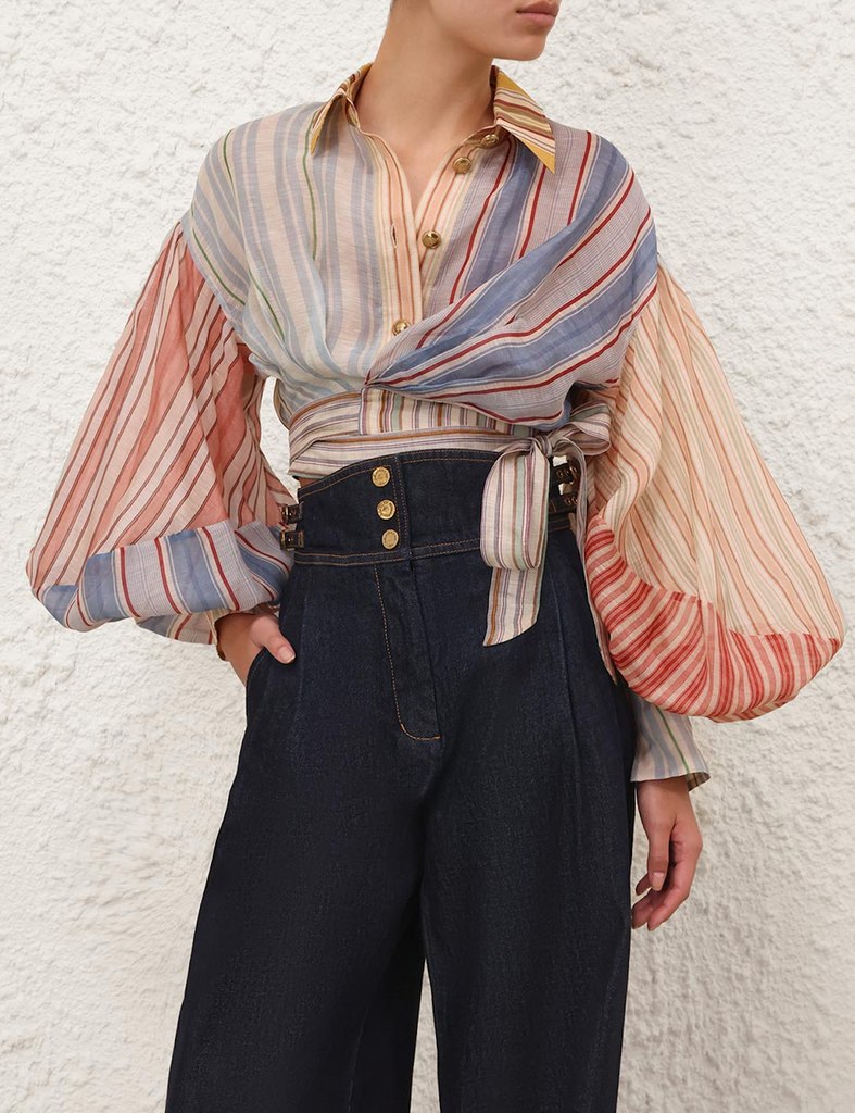 The Rebellion Striped Blouse in Spliced Stripes from The Zimmermann Cruise 2026 Collection, Twisted Romance. A silk-linen blouse featuring a classic collar, buttons down the centre front, long billow sleeves with exaggerated cuffs, finished with a wrap waist belt tied to one side.