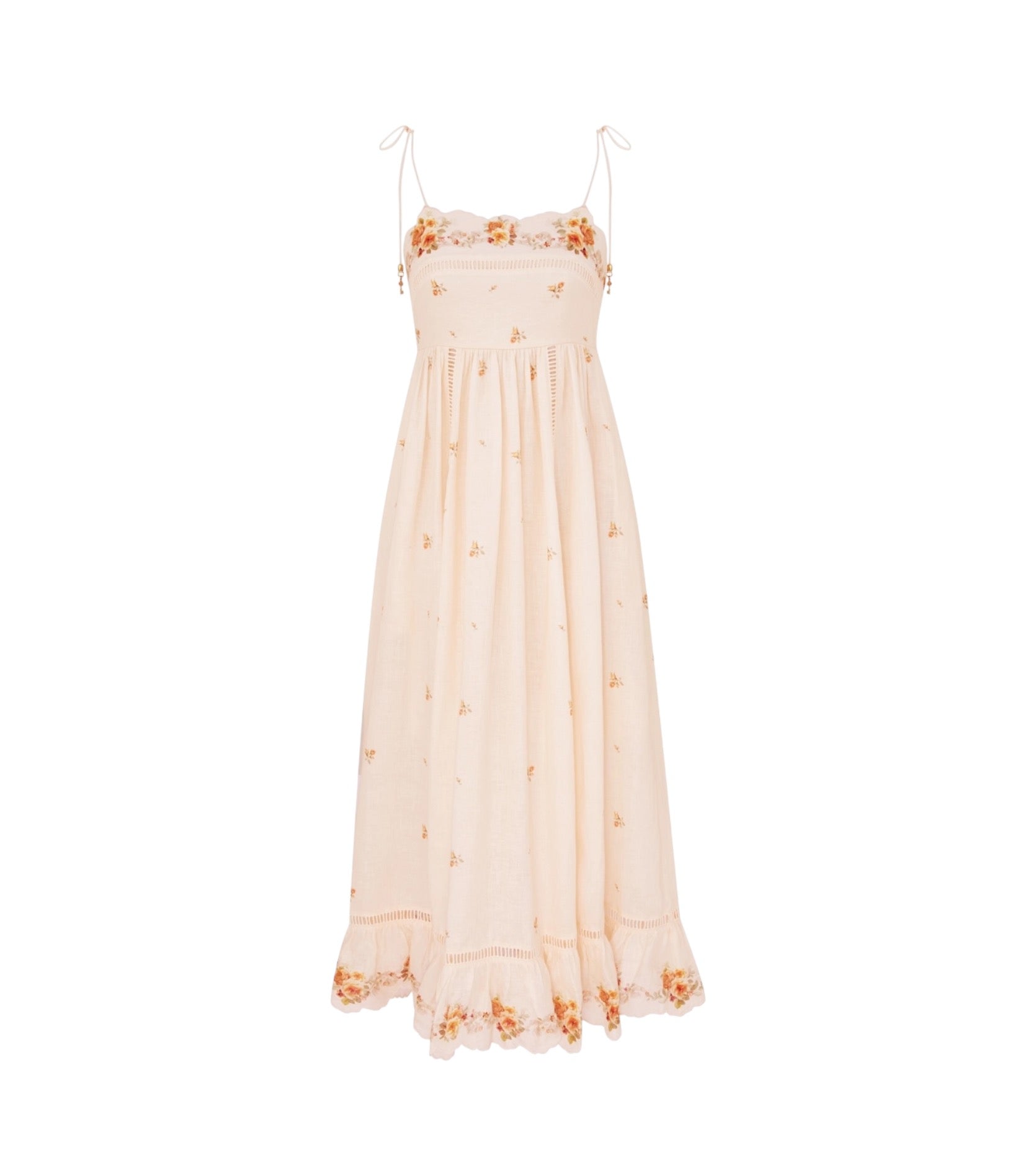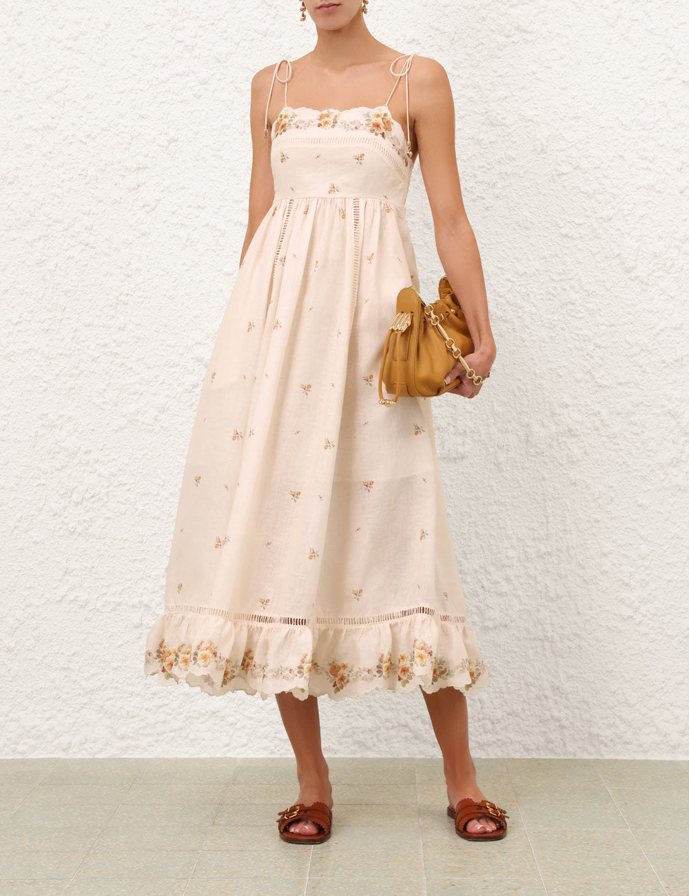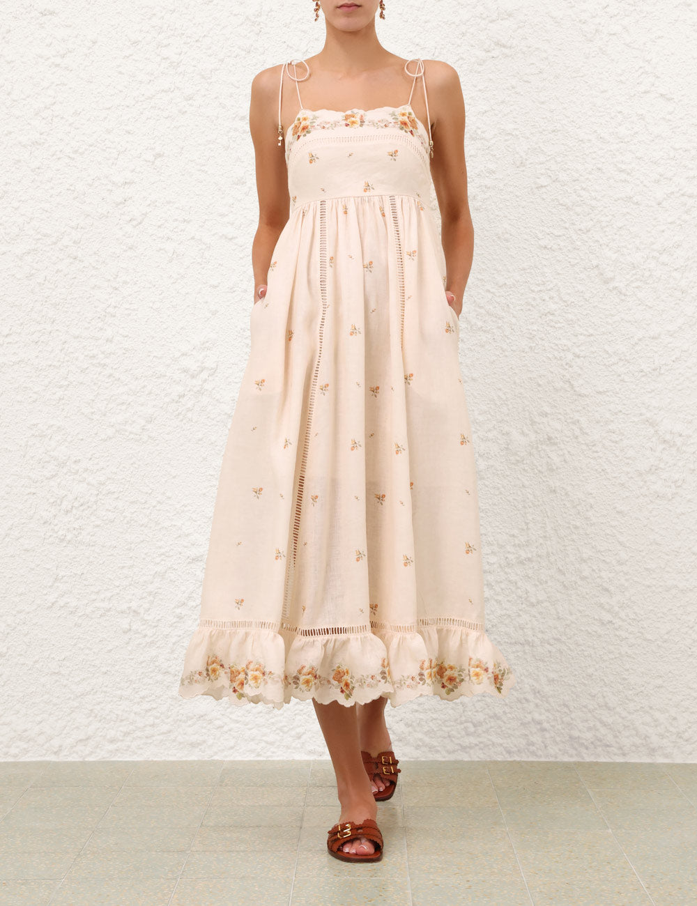 The Patience Cami Midi Dress in Cream/Yellow Rose from The Zimmermann Resort Swim 2026 Collection. A linen midi dress featuring a straight neckline, self-tie rouleau straps and functional side pockets, finished with an invisible zip closure at centre back and pleated skirt.