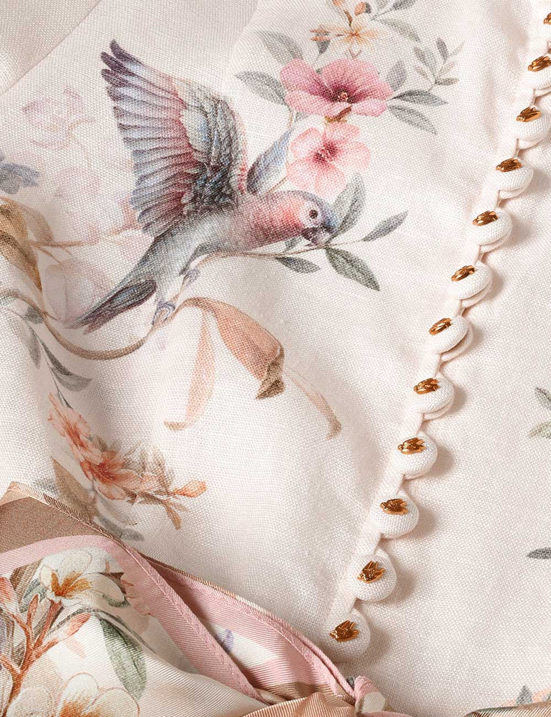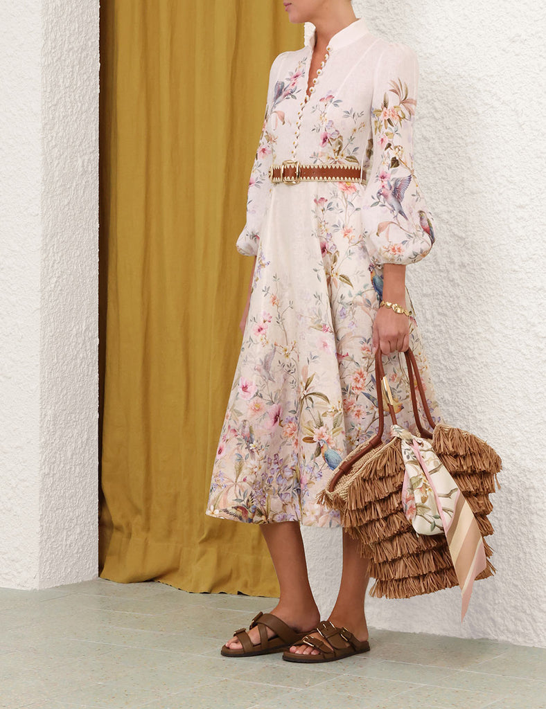 The Rebellion Button Midi Dress in Cream Aviary from The Zimmermann Cruise 2026 Collection, Twisted Romance. A linen midi dress featuring long blouson sleeves with elasticated cuffs, functional front buttons, finished with a removable scarf belt.