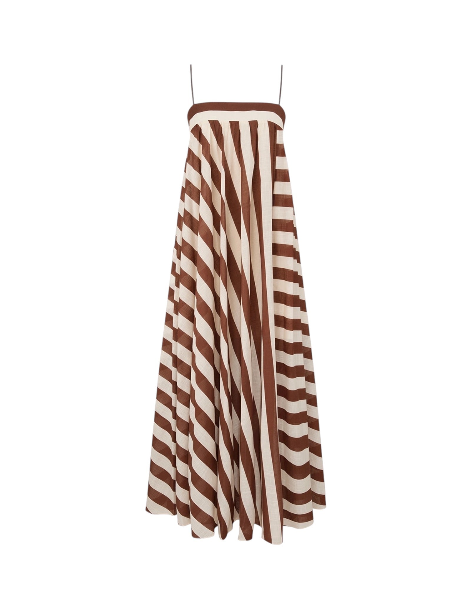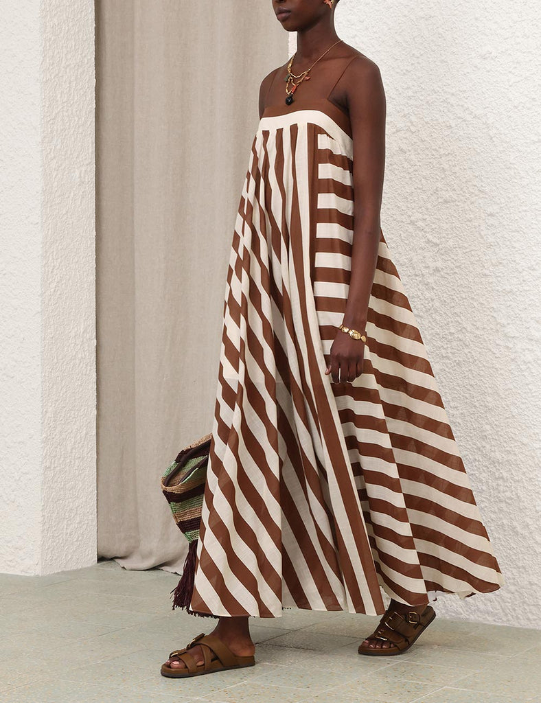 The Daylight Stripe Maxi Dress in Choc/Cream Stripe from our Resort Swim 2026 Collection. A cotton maxi dress featuring a straight neckline, adjustable straps, finished with contrasting stripes throughout and an invisible centre back zip closure.