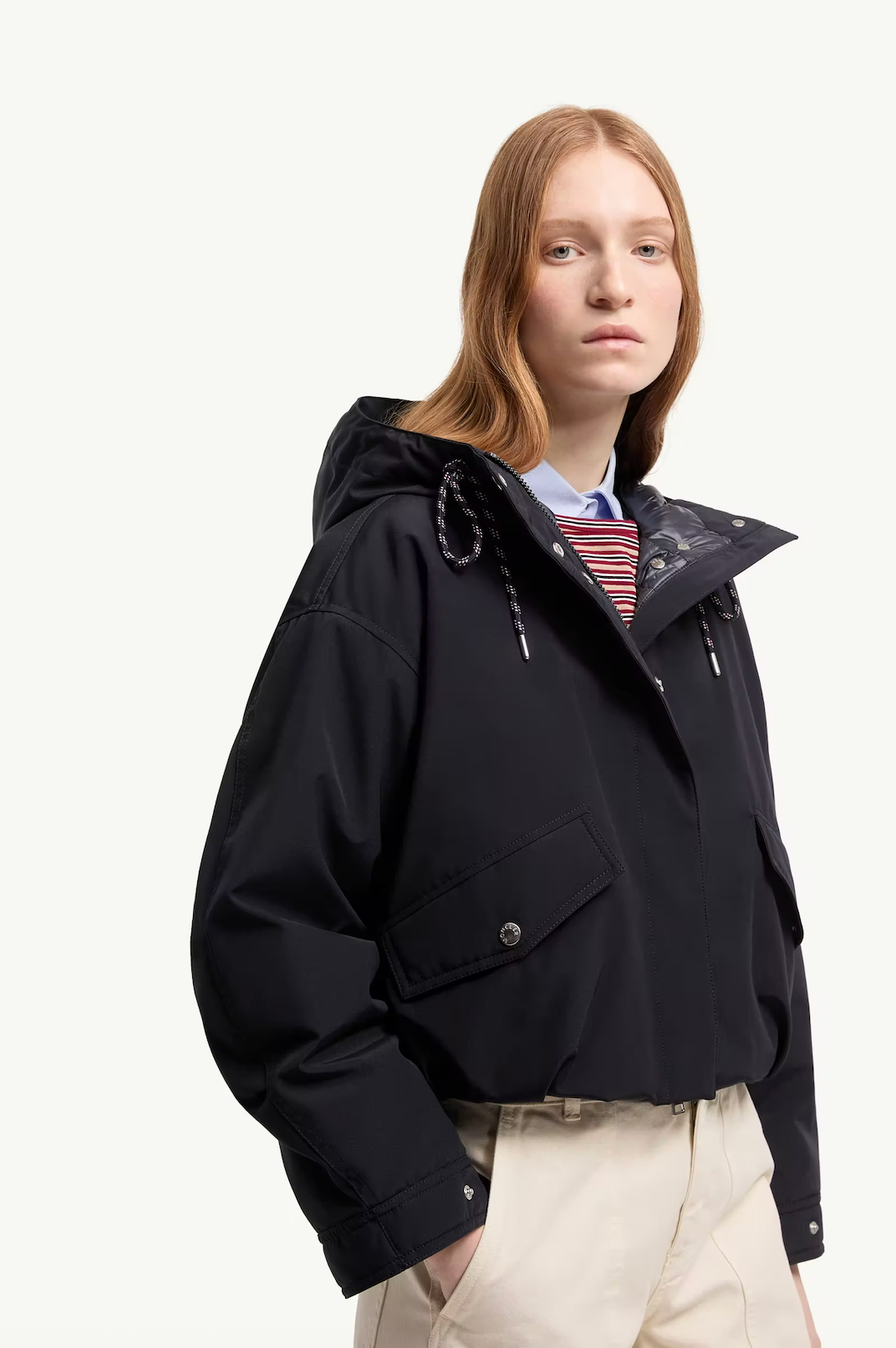 A game of proportions, the Eucalyptus subtly adds sophistication to the classic puffer jacket. The design creates a voluminous silhouette through gentle ruching and a cropped length with a fitted waistline. A detachable hood completes the design, offering protection when needed most.
