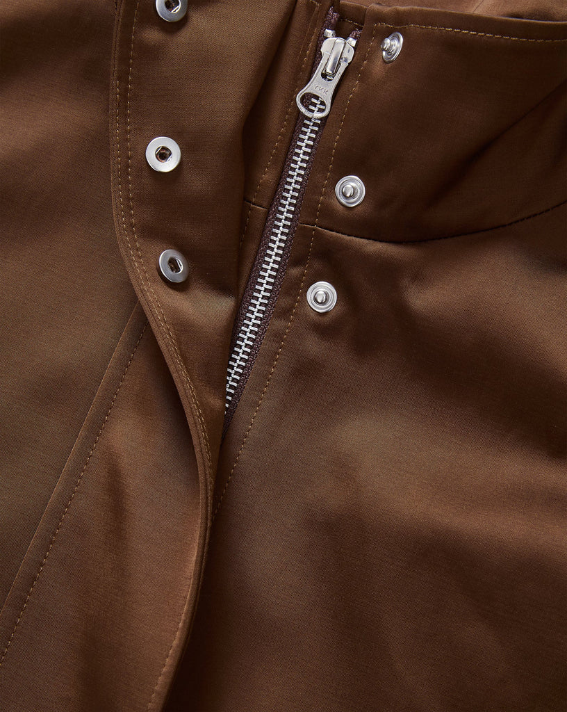 A cool take on the cropped jacket. Crafted from a tan cotton-blend twill, the Bateman is cut for a relaxed, oversized fit with an adjustable bungee at the hem. It features dropped shoulders, a buttoned funnel neck, and a concealed zipper closure for a clean finish, while angled flap pockets and belted cuffs add a tailored touch. Wear it casually with jeans or layer over tailored trousers—either way, you can't go wrong.