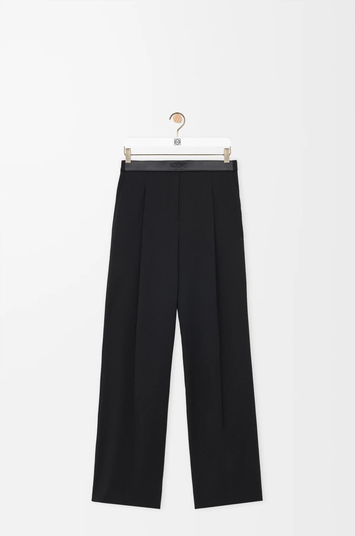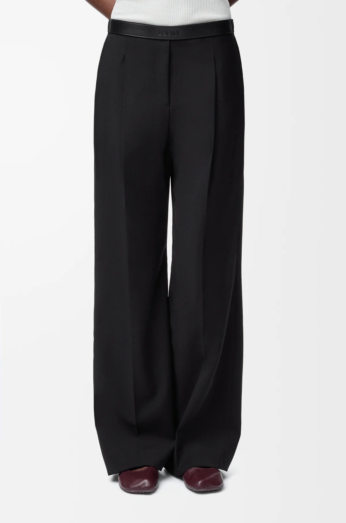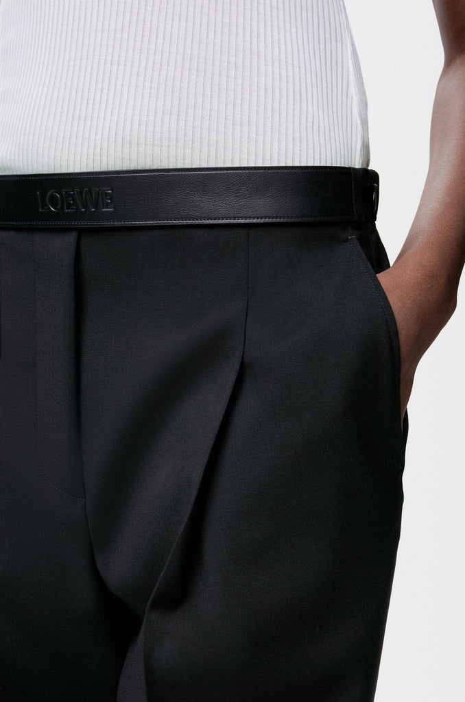 Trousers in lightweight fluid wool tailoring featuring a LOEWE-embossed leather waistband at the front.