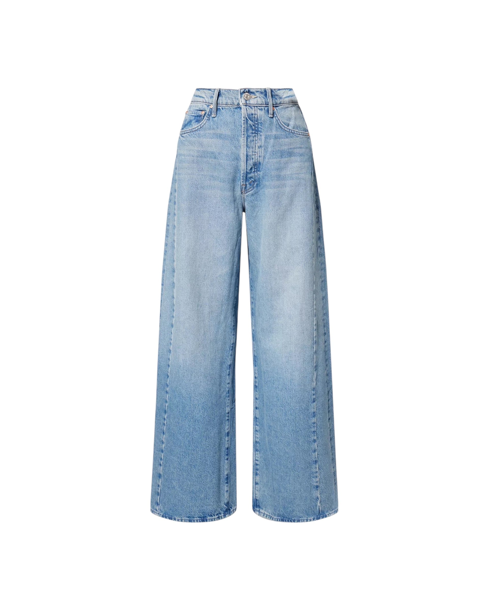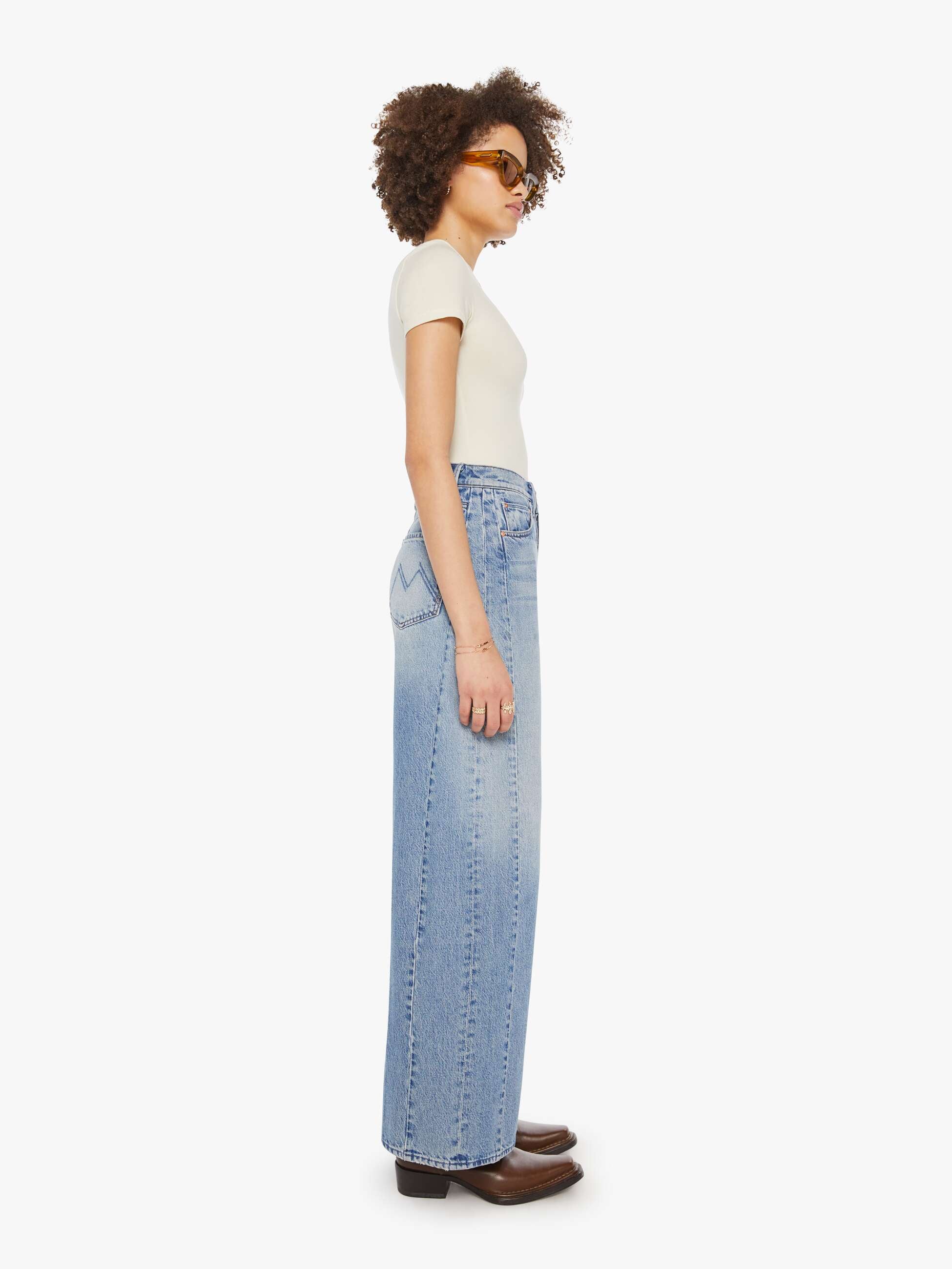 Get the jump on it. Super high-waisted barrel-leg jeans with a long 31-inch inseam, button fly, clean hem and relaxed fit. Made from rigid SUPERIOR denim, Leap At The Chance is a light blue with whiskering and fading at the knees.