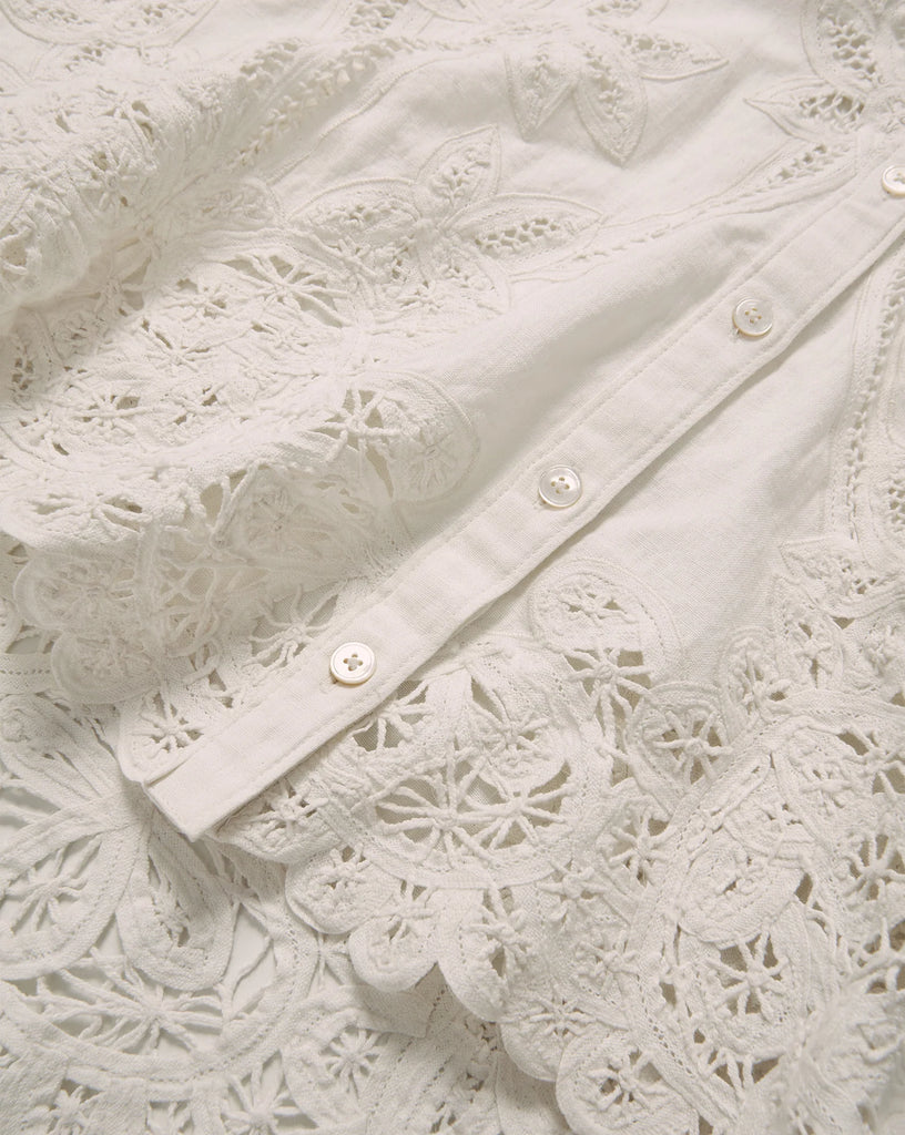 An elevated take on the classic button-down. Crafted from a premium cotton-linen blend in off-white, the Aderes features intricate eyelet detailing and scalloped edges for a feminine finish. Designed with button-cuffed sleeves and a collared neckline, it pairs effortlessly with the matching Daisy Pant or your favorite denim.