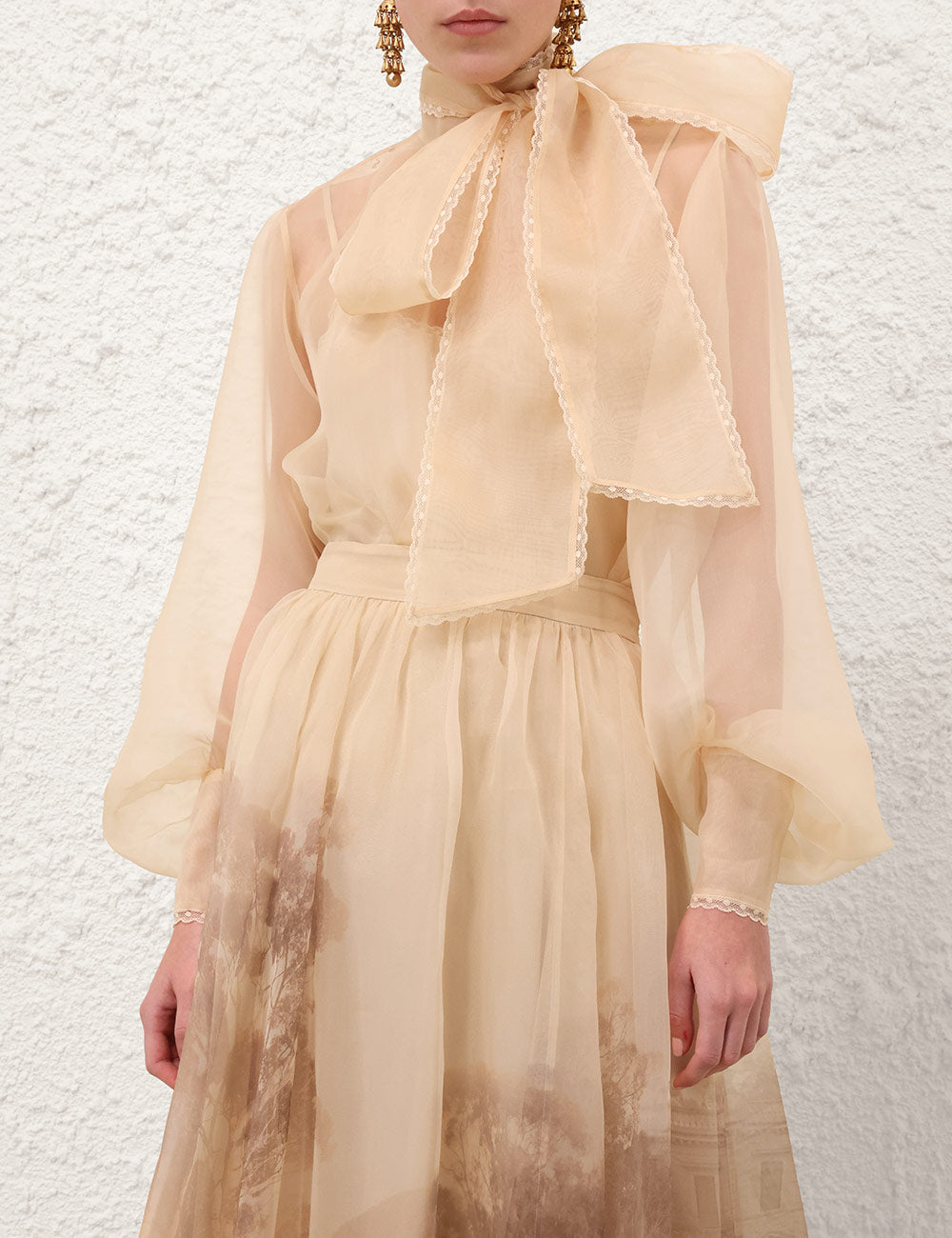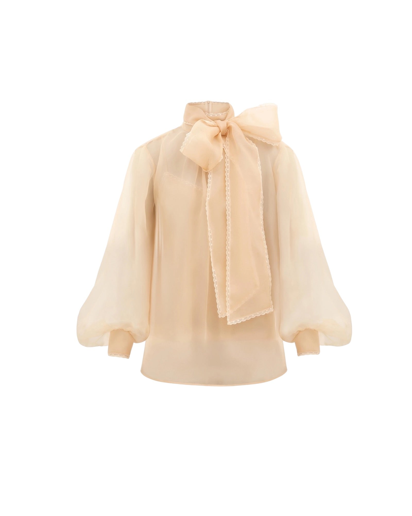 The Memento Organza Blouse in Sepia from The Zimmermann Fall 2025 Collection, Hypnotic. A silk organza blouse featuring a stand collar with pussybow necktie, long blouson sleeves, finished with an invisible zip closure at centre back.