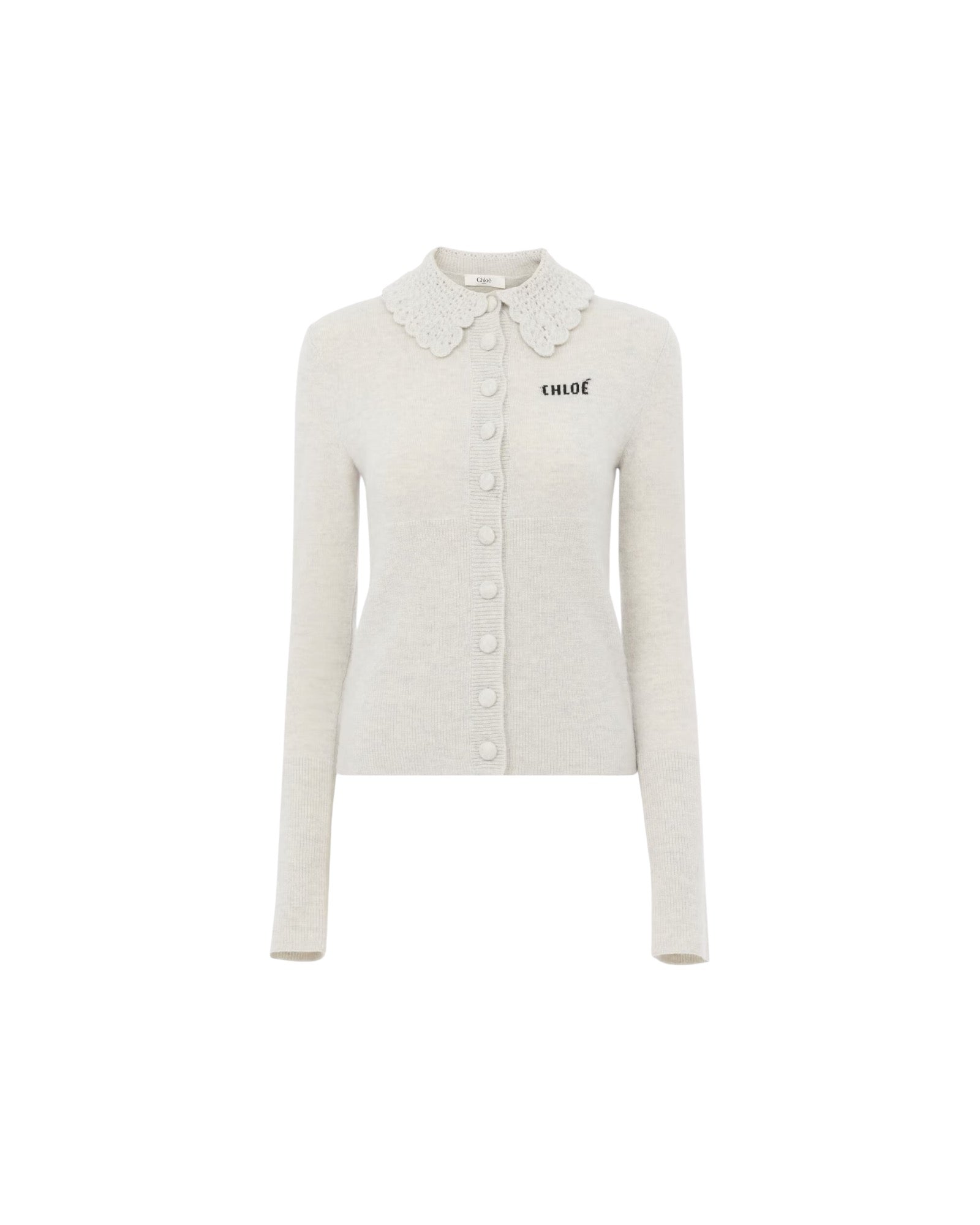 Fitted cardigan in a multistitch wool knit, featuring a guipure collar, fabric-covered buttons and Chloé logo embroidery at the chest.