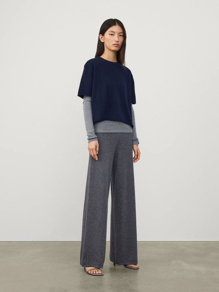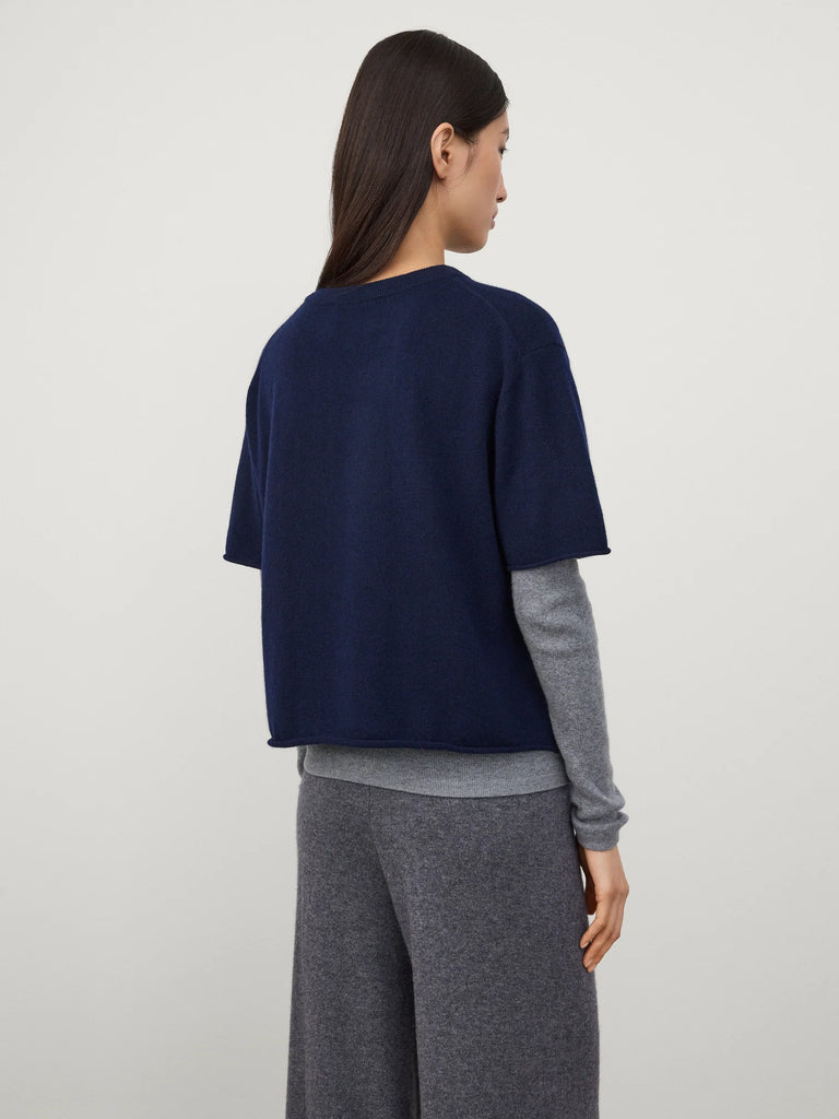 An everyday layering piece, the Cila T-shirt is crafted in soft, mid-weight cashmere for year-round wear. The slightly wide and cropped silhouette is framed by a crew neck, dropped shoulders and short sleeves, with a rolled hemline which crops at the hip.