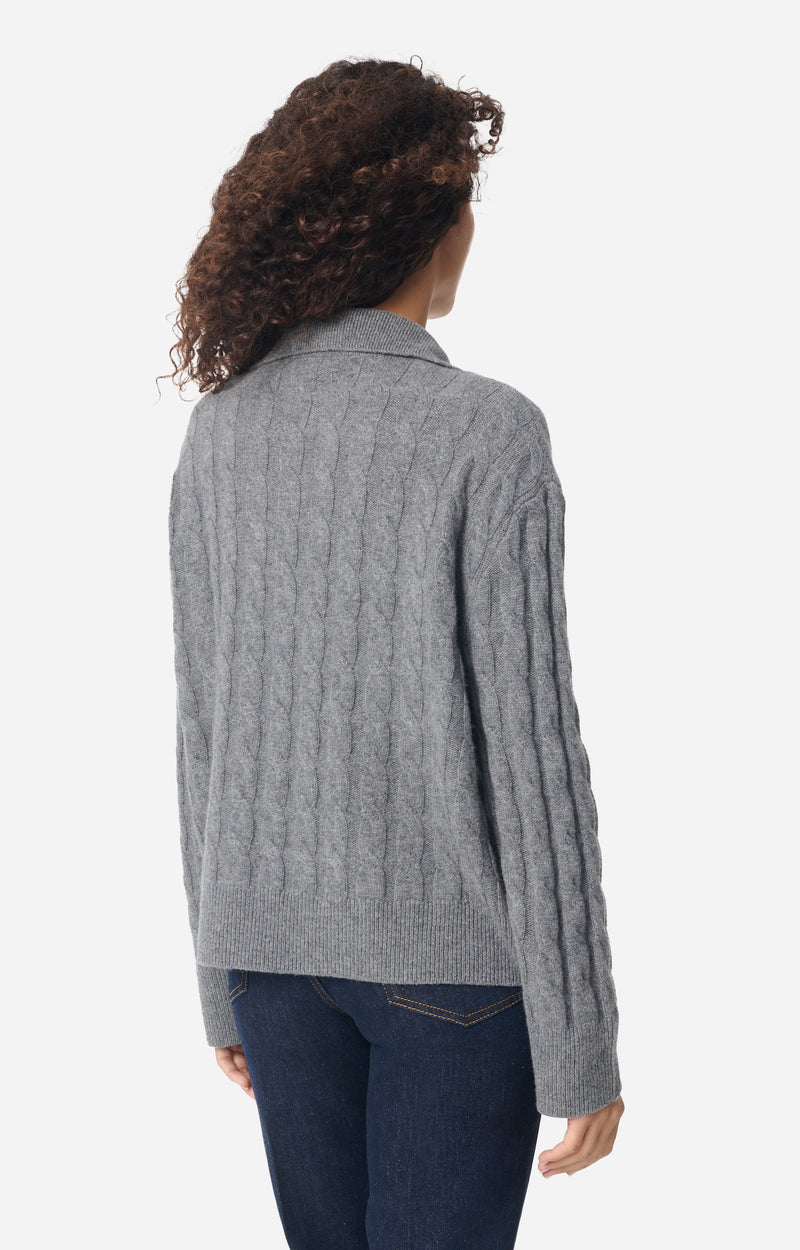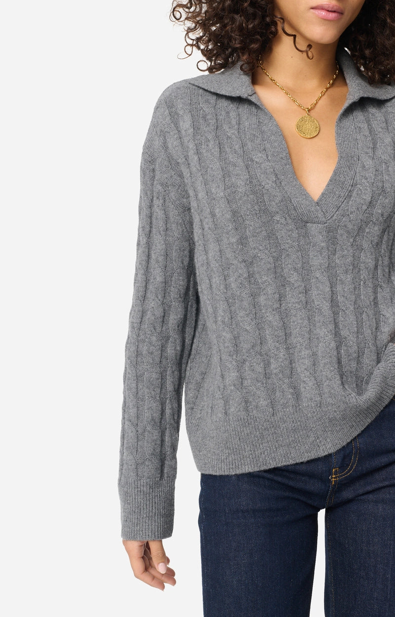 A knit with timeless charm, given a twist with an open collar and a cable knit texture that combines softness and modernity.