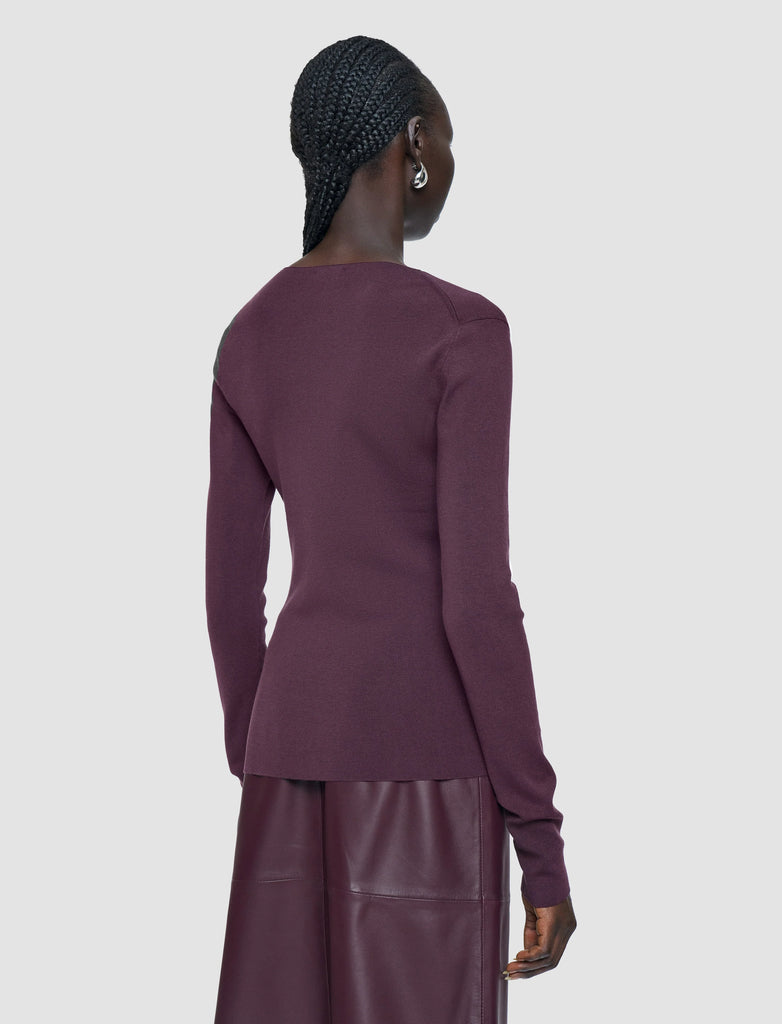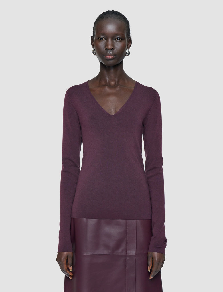 The Silk Stretch V neck top is a slim fit top, crafted from a stretchy silk blend. Offering shape and comfort, this essential piece is knitted together in a slim ribbed stitch.