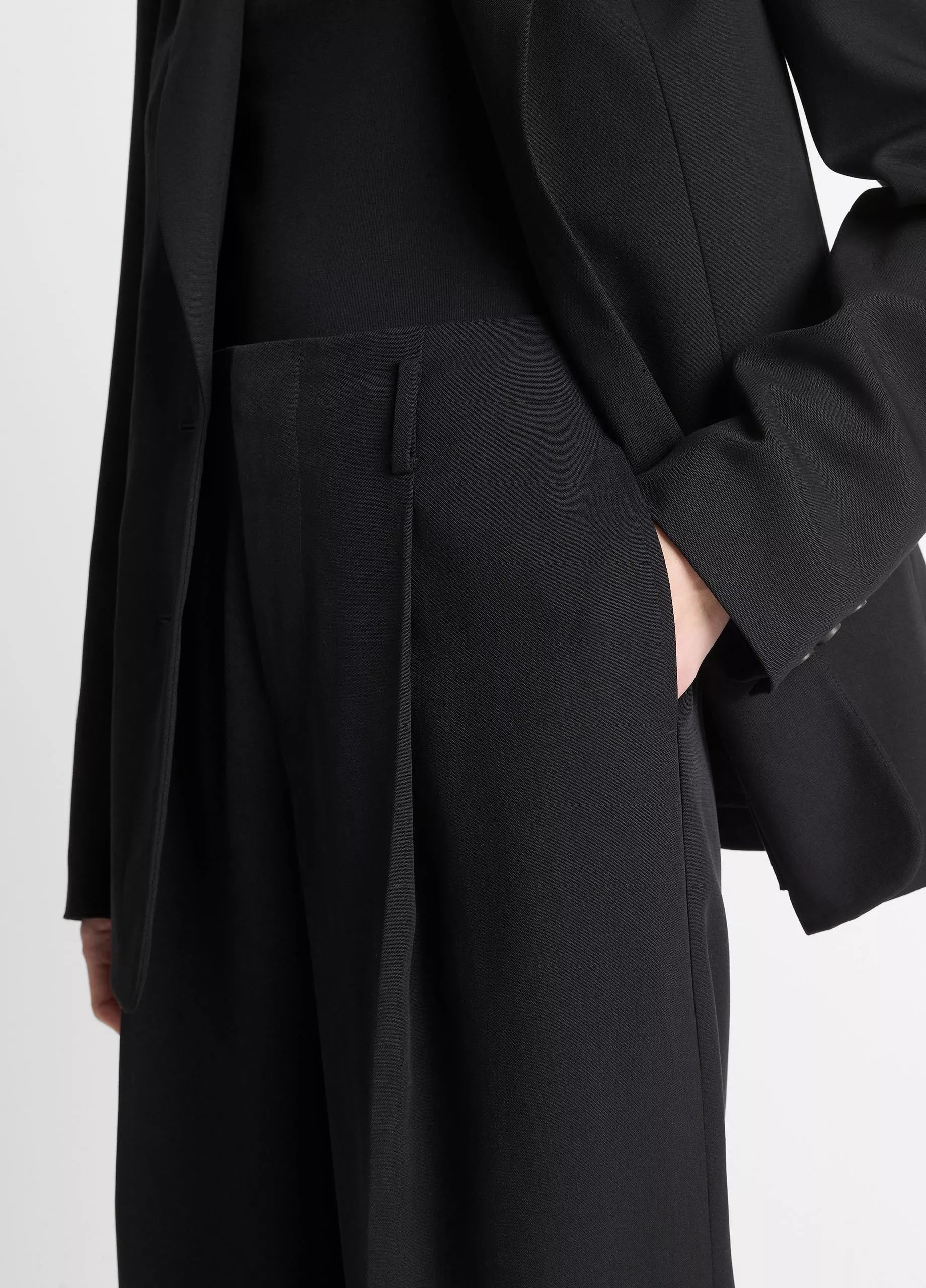 A pleated trouser is an undeniable wardrobe staple for all seasons. Ours is distinguished by its perfectly balanced, wide leg and refined Hollywood waist. And for the moments that call for a full suit: we made a matching oversized blazer.